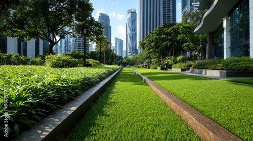 © Sumet, Fototapeta premium A vibrant urban park featuring lush green grass and modern skyscrapers, showcasing a harmonious blend of nature and architecture.