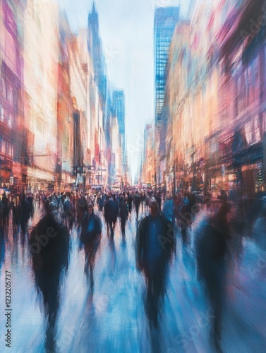 © Johannes, Obraz premium A vibrant urban scene with blurred pedestrians walking in a bustling shopping district, capturing the essence of city life.