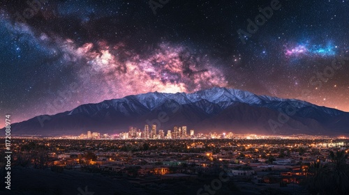 Fototapeta premium A vibrant urban skyline lit up at night, with the Milky Way and mountains forming a dramatic backdrop.