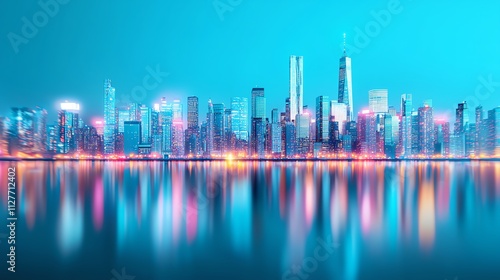 Fototapeta premium A vibrant urban skyline reflecting on calm waters at night, adorned with...