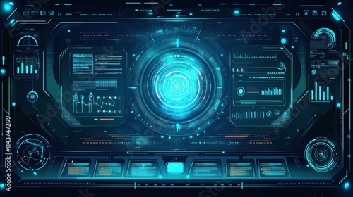 Fototapeta premium A vibrant vector augmented reality workspace with holographic displays, showcasing digital interfaces and 3D models.