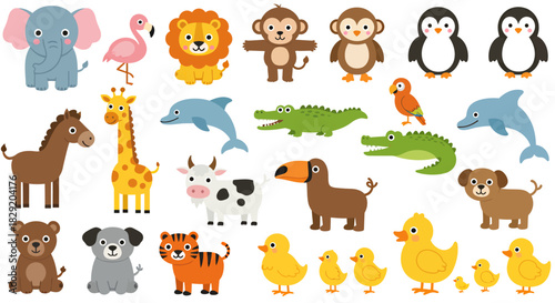 © Dieke, Naklejka premium A vibrant vector illustration showcases a delightful collection of cartoon animals, perfect for children's designs, educational materials, and playful projects, featuring a diverse array of creatures