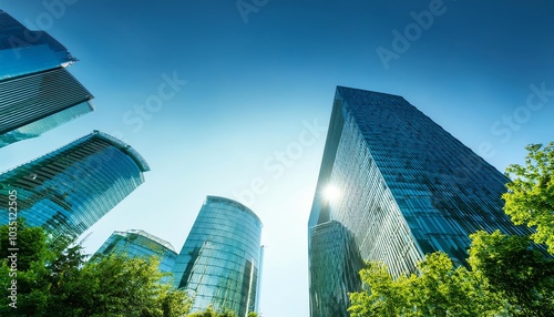 Fototapeta premium A vibrant view of modern skyscrapers reflecting sunlight against a clear blue sky, framed by greenery below.