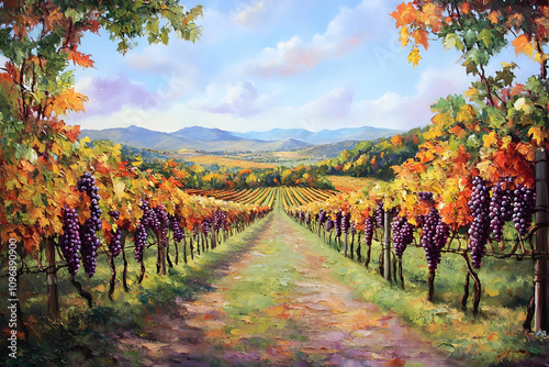© Abab, Fototapeta premium A vibrant vineyard scene with purple grapes and autumn foliage under a blue sky.
