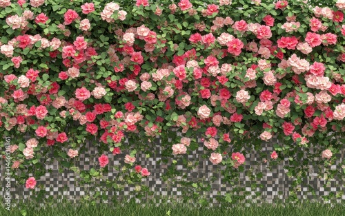 Fototapeta premium A vibrant wall of climbing roses, various shades of pink, cascading over a...