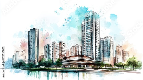 Fototapeta premium A vibrant watercolor illustration showcasing a modern city skyline with towering buildings and lush green surroundings, capturing urban life and culture.