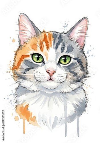 © Biggy, Fototapeta premium A vibrant watercolor portrait of a cat with a calico coat, featuring detailed facial features and expressive green eyes, highlighted by artistic paint splatters