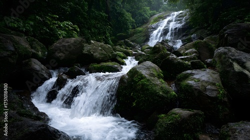 © Bussakon, Fototapeta premium A vibrant waterfall cascades over moss covered rocks through a lush green jungle setting