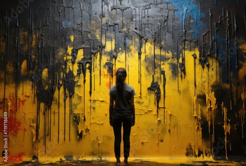 © LifeMedia, Obraz premium A vibrant woman stands confidently in front of a bold and abstract painting, embodying the intersection of modern art and street culture with her own artistic expression