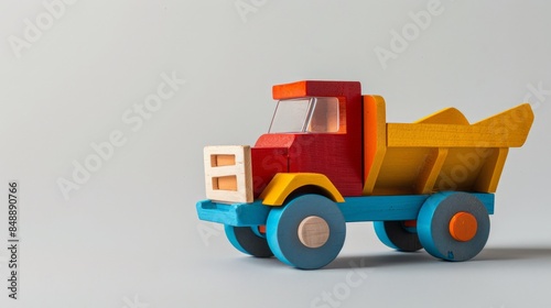 Fototapeta premium A vibrant wooden dump truck toy sits on a light gray surface
