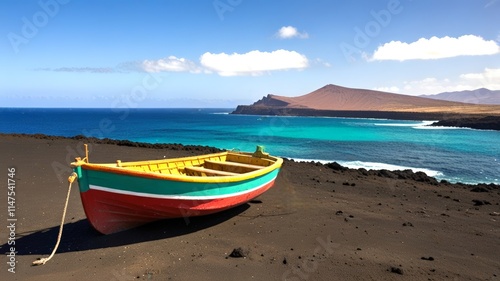 Naklejka premium A vibrant wooden fishing boat rests on a black volcanic beach near a crystal-clear turquoise sea, framed by dramatic cliffs under a bright blue sky.