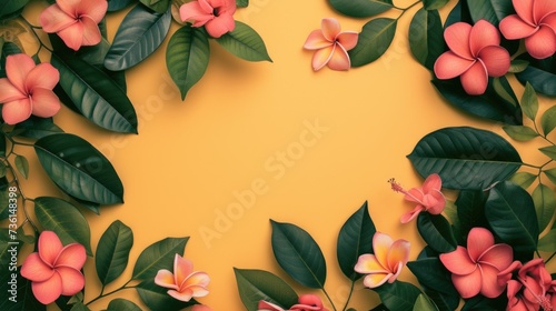 Fototapeta premium A vibrant yellow background with beautiful pink flowers and lush green leaves. Perfect for adding a pop of color and nature-inspired beauty to any project