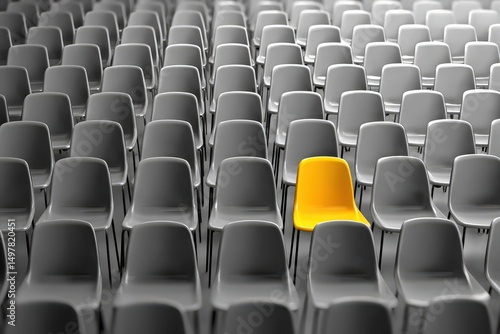 © Zurel, Fototapeta premium A vibrant yellow chair stands out among rows of gray seating in a minimalist setting