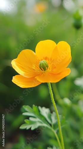 Fototapeta premium A vibrant yellow flower swaying gently in a lush green garden under soft...