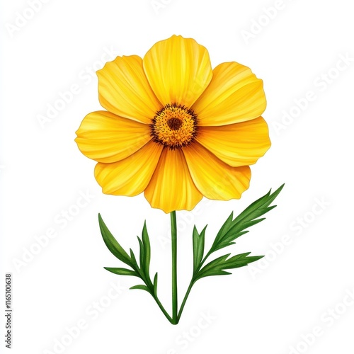 Fototapeta premium A vibrant yellow flower with broad petals and a central disk, accompanied by green leaves, representing beauty and nature.