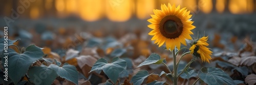 Naklejka premium A vibrant yellow sunflower against a blurred, warm-toned background with fallen leaves