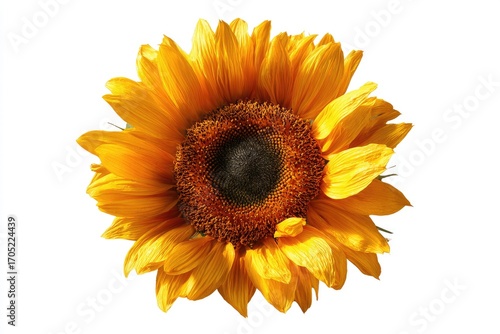 © Nakku, Fototapeta premium A vibrant yellow sunflower, fully bloomed, isolated on a white background; its dark brown center is surrounded by numerous bright yellow petals, some slightly drooping