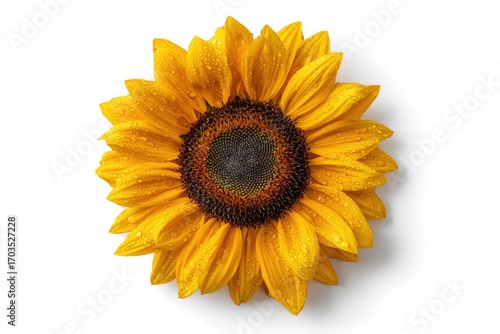 © Latte, Fototapeta premium A vibrant yellow sunflower with dew drops on its petals, isolated on a white background, viewed from directly above