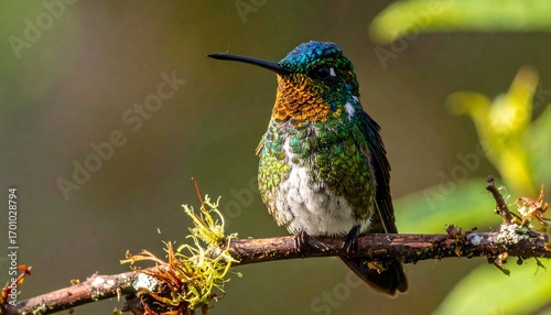Obraz premium A vibrantly colored hummingbird perches serenely on a branch, showcasing its iridescent plumage in a shallow depth-of-field shot.