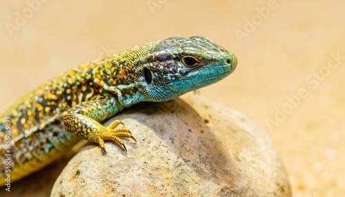 © Idris, Fototapeta premium A vibrantly colored lizard rests on a stone, showcasing its intricate patterns and striking turquoise hues against a light beige backdrop.