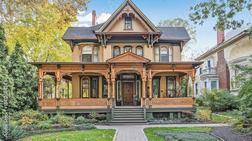 Fototapeta premium A Victorian home in the middle of a restoration project, showcasing its ornate woodwork and refreshed paint
