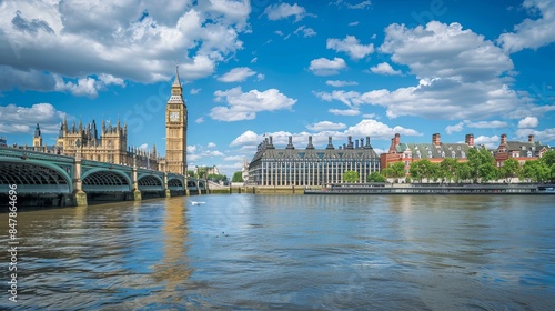 Fototapeta premium A view across the Thames River to Elizabeth Tower, also known as Big Ben, at the Palace of Westminster in London.