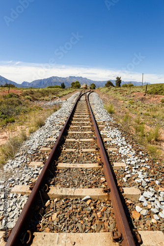 © Jacques Hugo, Fototapeta premium A view along railroad tracks towards high mountains in the distance, near Worcester, South Africa.