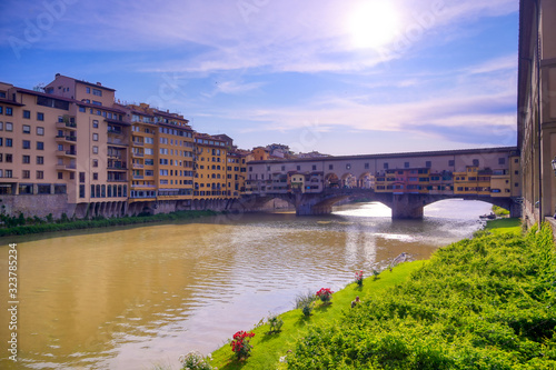 © Jbyard, Fototapeta premium A view along the Arno River towards the Ponte Vecchio in Florence, Italy.