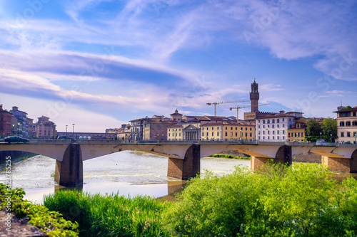 Fototapeta premium A view along the Arno River towards the Ponte Vecchio in Florence, Italy.