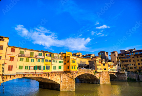 © Jbyard, Fototapeta premium A view along the Arno River towards the Ponte Vecchio in Florence, Italy.