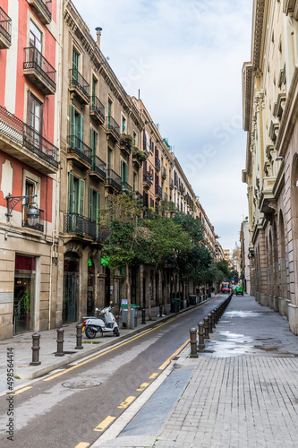 Obraz premium A view down a side street of the Rambles in Barcelona on a spring day
