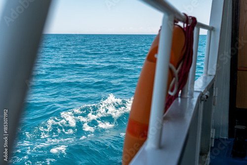 Fototapeta premium A view from a boat or ferry of a large body of water with mountains in the distance and a clear blue sky. A metal railing and an orange lifebuoy are visible in the foreground.
