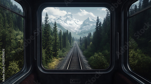 © CreativeCreations, Obraz premium A view from inside a train looking out the window, mountain and forest view