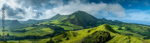 © Yellow Blossom, Fototapeta premium A View From The Peak of a Lush Mountain, Azores, Portugal, Landscape Photography, Green Hills, Panoramic View , Azores