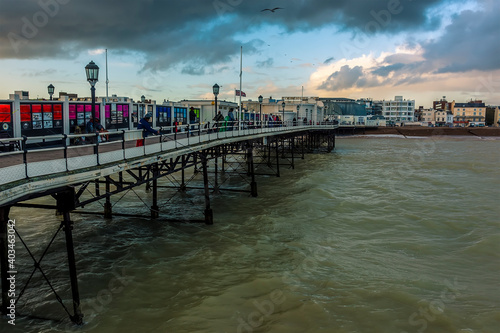 © Nicola, Obraz premium A view from the pier towards the town of Worthing, Sussex, UK at sunset