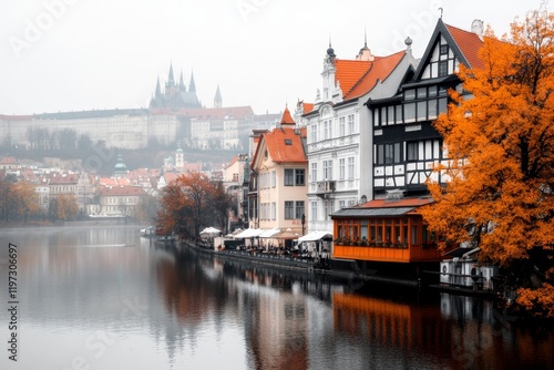 © Thanyarat, Fototapeta premium A view from VyÅ¡ehrad Fortress, overlooking the Vltava River and the sprawling cityscape of Prague