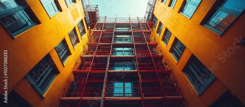 © Alienmarsh, Fototapeta premium A view of a building under construction, showcasing scaffolding and vibrant orange walls.
