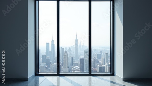 Fototapeta premium A view of a city skyline with skyscrapers seen through a large window,...