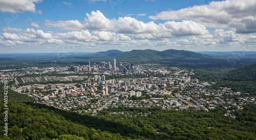 © Kenny, Obraz premium a view of a city surrounded by trees and mountains