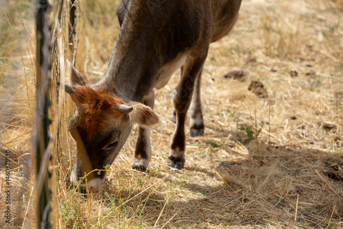 © DAVID, Fototapeta premium A view of a cow eating grass next to a fence.