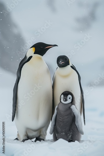 Fototapeta premium A view of a cute Emperor Penguin family with a small offspring on snowy Antarctic landscape