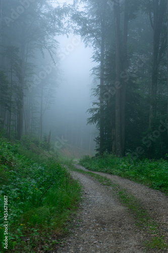 © Remus Rigo, Fototapeta premium A view of a dark forest with fog between the trees