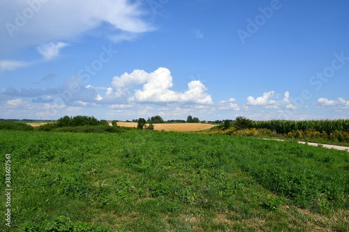 © Rafal, Obraz premium A view of a dense field, meadow or pastureland surrounded with trees, shrubs, and hills from all sides seen on a sunny yet cloudy summer day on a Polish countryside during a hike
