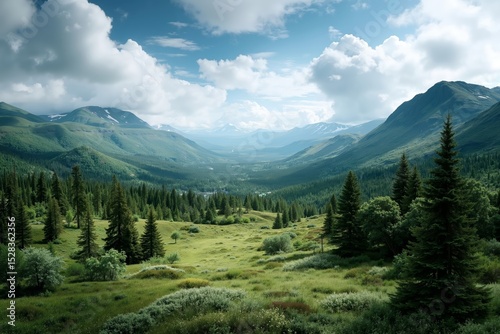 © Oleksandr Pashchenko, Fototapeta premium A view of a grassy field with trees and mountains in the background