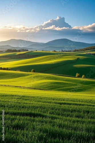 © haiqiang, Fototapeta premium a view of a green field with hills in the distance