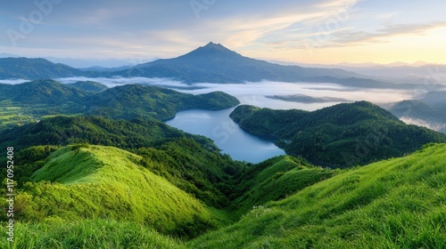 Fototapeta premium A view of a lake surrounded by green hills and mountains