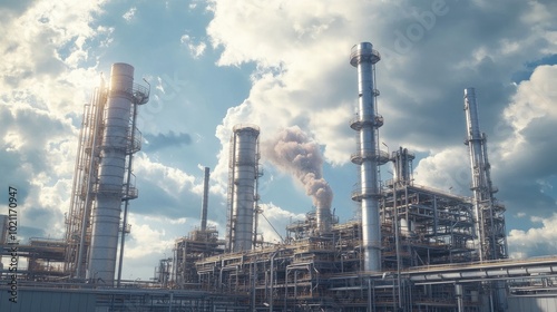 © Nathan, Obraz premium A view of a modern industrial complex with towering smokestacks against a cloudy sky.