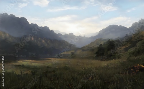 © @uniturehd, Naklejka premium a view of a mountain range with a grassy field in the foreground