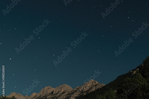 © Fotograf, Fototapeta premium A view of a mountain under a starry night sky