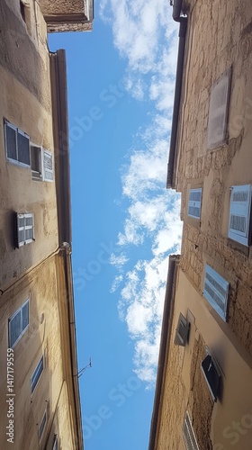 © Anak, Fototapeta premium A view of a narrow alleyway with a vibrant blue sky.